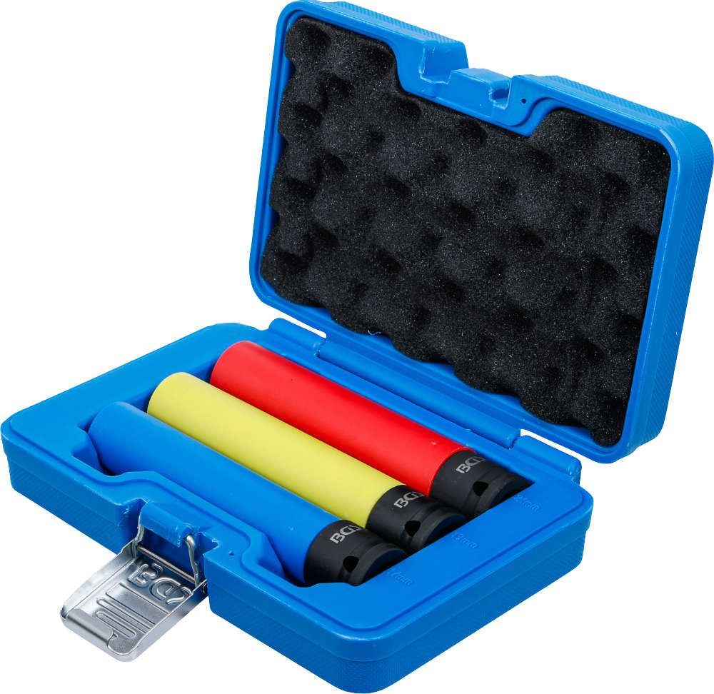 Set met extra diepe slagdoppen voor gebruik met hand- en slagmoersleutels. Voorzien van kunststof mantel en kunststof binnensleeve ter bescherming van aluminium velgen. De doppen zijn kleurgecodeerd voor snelle maatidentificatie. Dankzij het extra lange ontwerp is er voldoende afstand tot het spatbord tijdens gebruik. Doppen kunnen op de slagmoersleutel worden gefixeerd met pen en O-ring. Geleverd in een blaasgegoten opbergkoffer.