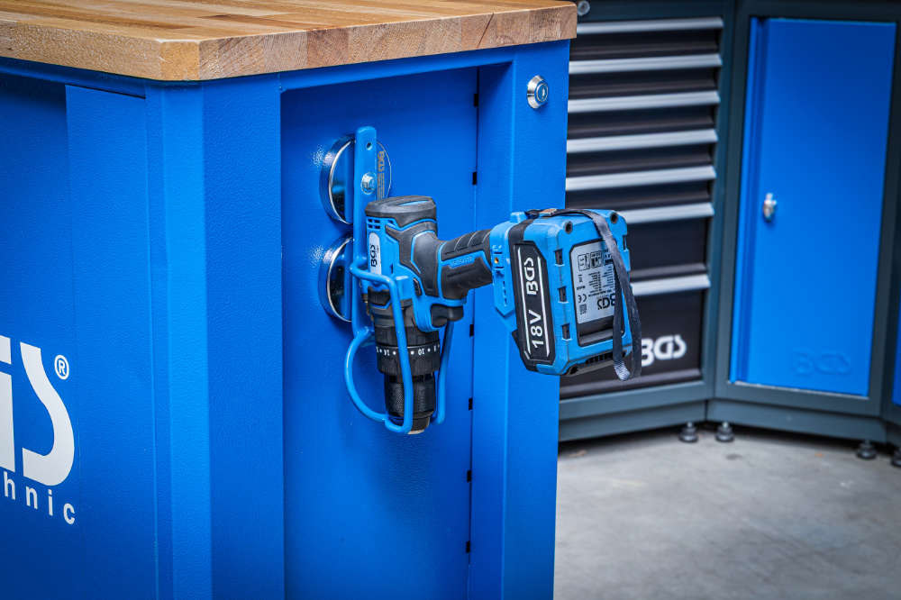 Deze magnetische houder is een praktische organizer voor elke werkplaats. Hij maakt het mogelijk om een slagmoersleutel direct aan een werkplaatswagen of andere metalen oppervlakken te bevestigen. Dankzij de twee extra sterke magneten blijft de houder stevig op zijn plaats, waardoor je gereedschap altijd binnen handbereik is.