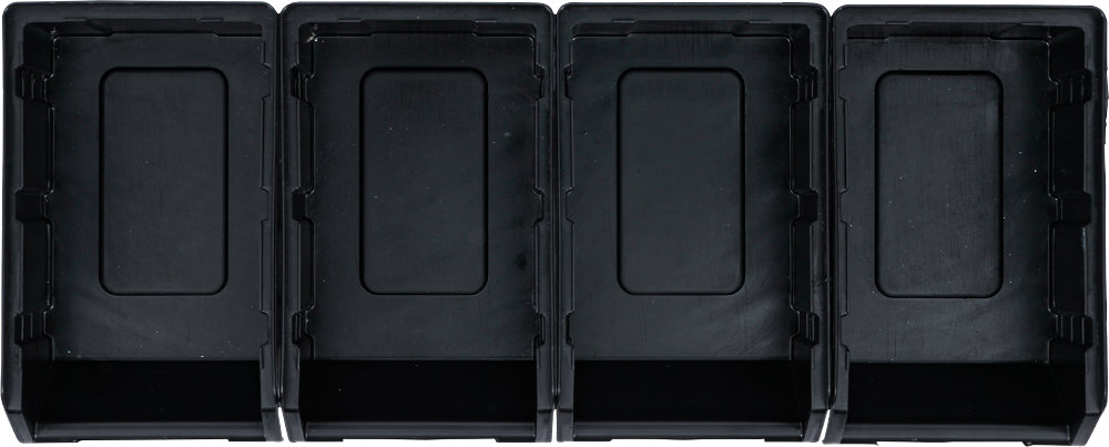 Set van 4 identieke opbergboxen met handgreepstrook, geschikt voor horizontale ophanging in een opbergsysteemcombinatie. Ideaal voor het overzichtelijk opbergen van kleine onderdelen. Voorzien van kunststof clips voor extra borging.
