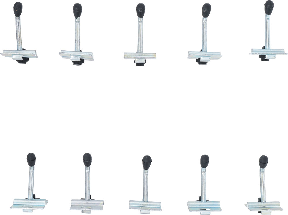 Set van 10 enkele haken met een contactoppervlak van 40 mm, geschikt voor het ophangen van gereedschap zoals schroevendraaiers en T-handgrepen in een modulaire opbergsysteemcombinatie. Voorzien van kunststof clips voor extra borging.