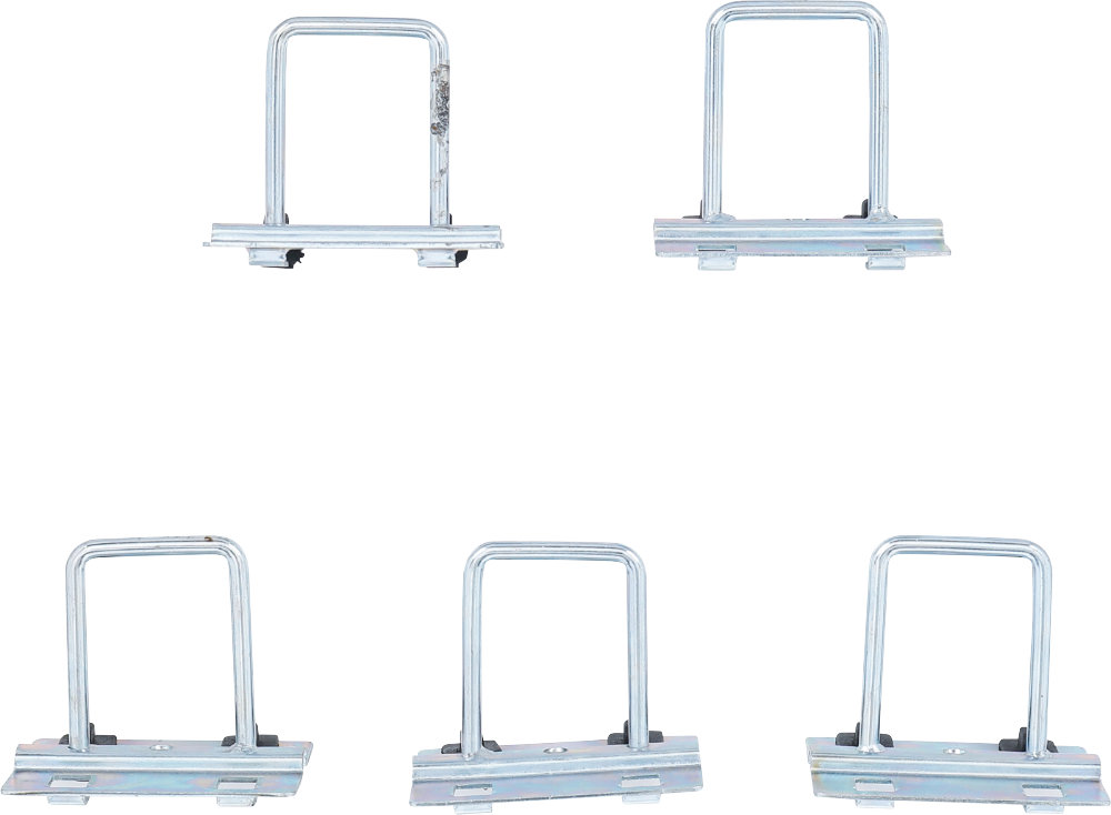 Set van 5 U-vormige haken met een contactoppervlak van 40 mm, geschikt voor het ophangen van zwaarder gereedschap zoals hamers binnen een modulaire opbergsysteemcombinatie. Wordt geleverd met kunststof clips voor extra borging.