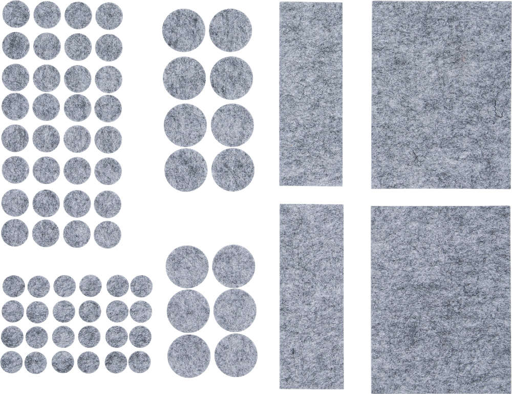 Complete set zelfklevende viltglijders voor het beschermen van vloeren en meubels. Deze viltdoppen en viltmatten zorgen voor krasbescherming, geluiddemping en maken het verplaatsen van stoelen, tafels en andere meubels eenvoudig en vloer-vriendelijk. Geschikt voor harde, gladde vloeren zoals laminaat, parket, kunststof en steen. Ook toepasbaar onder luidsprekers, lampen en decoratieve objecten.