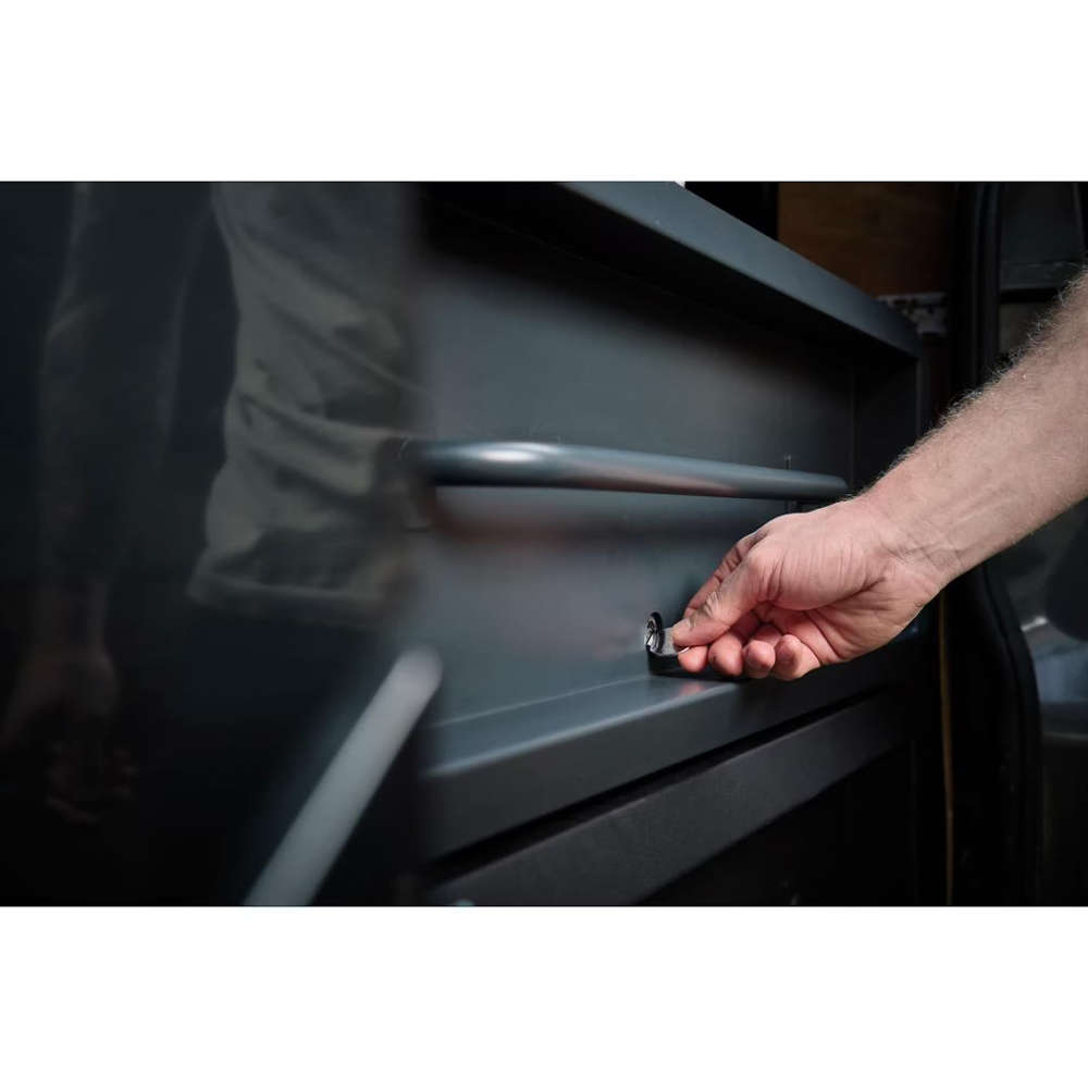 Voor maximale beveiliging is de BUNKER K1 uitgerust met een robuust veiligheidsslot (inclusief twee sleutels) en een discrete houder voor een AirTag of ander Bluetooth-traceerapparaat, zodat u uw gereedschap altijd kunt lokaliseren. Door meerdere K1-units op elkaar te stapelen, creëert u een modulair en overzichtelijk opbergsysteem dat zowel ruimtebesparend als praktisch is.