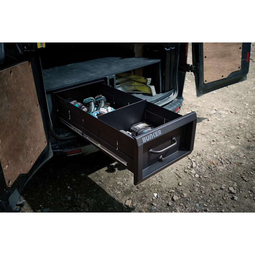 De BUNKER S1 Sliding Tool Storage Box is ontworpen voor veilige en efficiënte opslag van gereedschap in bedrijfsvoertuigen. Deze robuuste stalen gereedschapslade wordt stevig aan de vloer van de bestelwagen bevestigd en biedt optimale bescherming tegen diefstal, terwijl uw gereedschap overzichtelijk en gemakkelijk bereikbaar blijft.