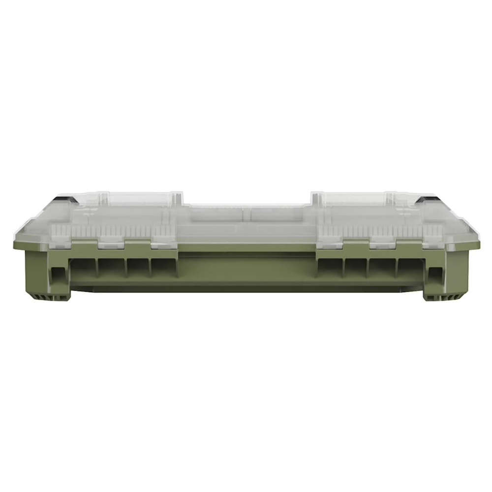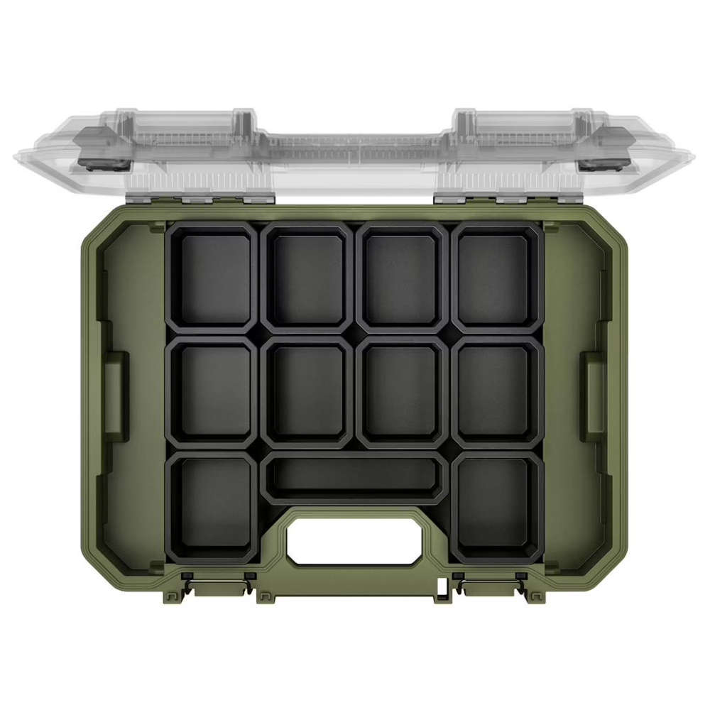 Binnenin bevinden zich 11 afsluitbare bins plus extra opbergruimte, waardoor kleine componenten overzichtelijk en veilig opgeborgen blijven. De transparante deksel maakt directe inhoudscontrole mogelijk, terwijl het geïntegreerde handvat zorgt voor eenvoudig transport. Met IP65-bescherming tegen stof en water blijven onderdelen beschermd tegen vuil en vocht, zelfs in veeleisende werkomgevingen.
