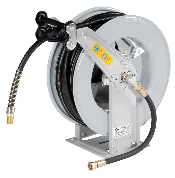 Zware industriële slanghaspel met open huis, uitgevoerd met thermisch verzinkte stalen cassette en duurzame poedercoating. Bestand tegen weersinvloeden en UV-straling. De interne luchtkanalen zijn van corrosiebestendig composietmateriaal. Voorzien van 20 meter rubberen luchtslang, versterkt met kunstvezel.