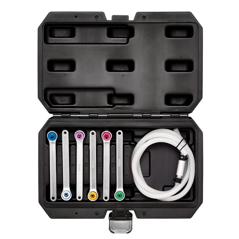 Professionele remontluchtingssleutelset voor het ontluchten van remsystemen zonder het verwijderen van de wielen of het heffen van het voertuig. De sleutels zijn vervaardigd uit hoogwaardig staal met een satijnen afwerking voor extra corrosiebescherming. Elke sleutel is kleurgecodeerd voor snelle maatidentificatie. De meegeleverde aftapslang met terugslagklep voorkomt dat lucht terug in het systeem stroomt. Geleverd in een stevige kunststof opbergkoffer.