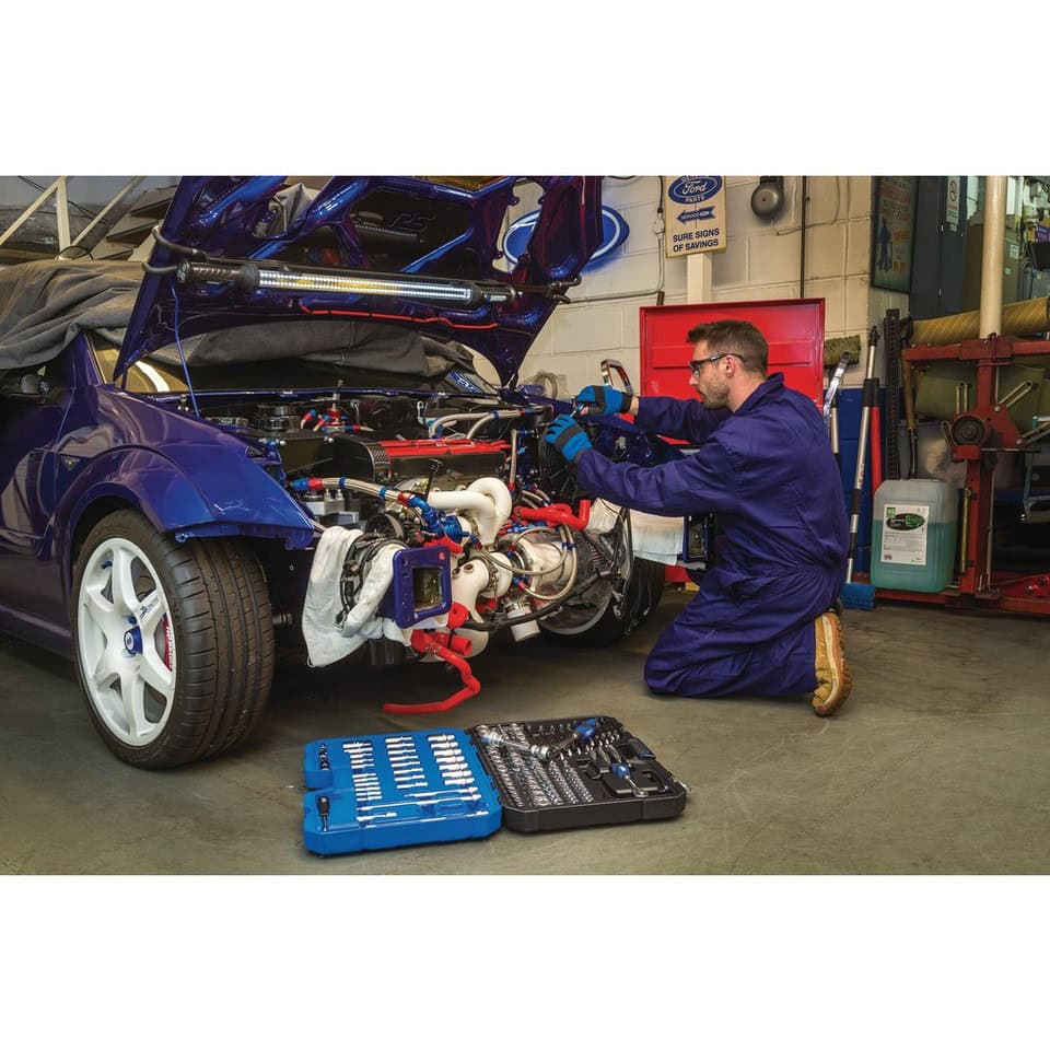 Uitgebreide doppenset met metrische en imperiale doppen in drie aandrijfmaten. De zeskantdoppen zijn vervaardigd uit gehard en getemperd chroomvanadiumstaal met microsatijnen afwerking. Elke dop heeft een gekartelde ring voor extra grip. Inclusief 72-tands omkeerbare ratels en diverse toebehoren in een kunststof opbergkoffer.