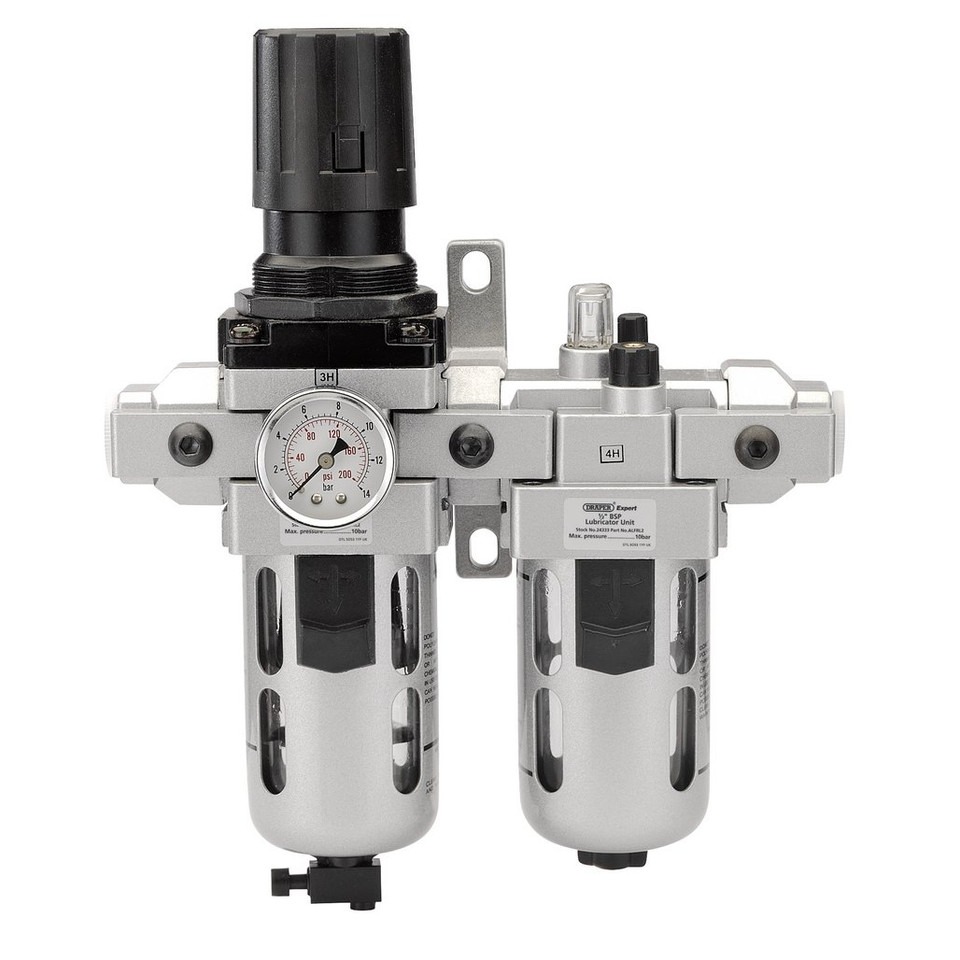 Combinatie-eenheid voor het filteren, regelen en smeren van perslucht. Verwijdert vocht en vuil uit de luchtstroom en voegt gecontroleerd smeermiddel toe aan het gereedschap. Voorzien van een transparante polycarbonaat schroefkom met aluminium behuizing en een 40 micron filter. Inclusief manometer met dubbele schaal (bar/psi) en wandmontagebeugel.