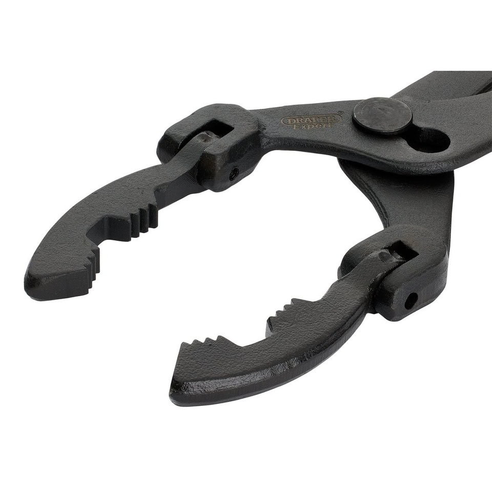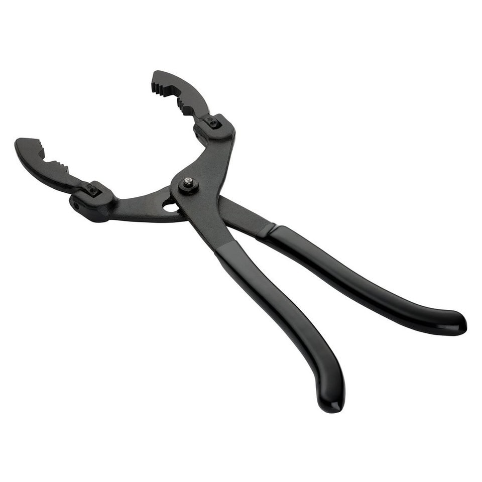 Verstelbare oliefiltertang voor het eenvoudig verwijderen van oliefilters, ook op moeilijk bereikbare plaatsen. Uitgerust met een slipgewricht voor snelle maatverstelling en draaibare bekken die instelbaar zijn op 30°, 60° of 90°. Het geribbelde bekontwerp biedt een stevige grip, terwijl de kunststof beklede handgrepen zorgen voor comfortabel gebruik.