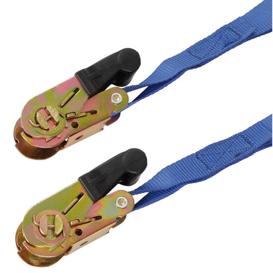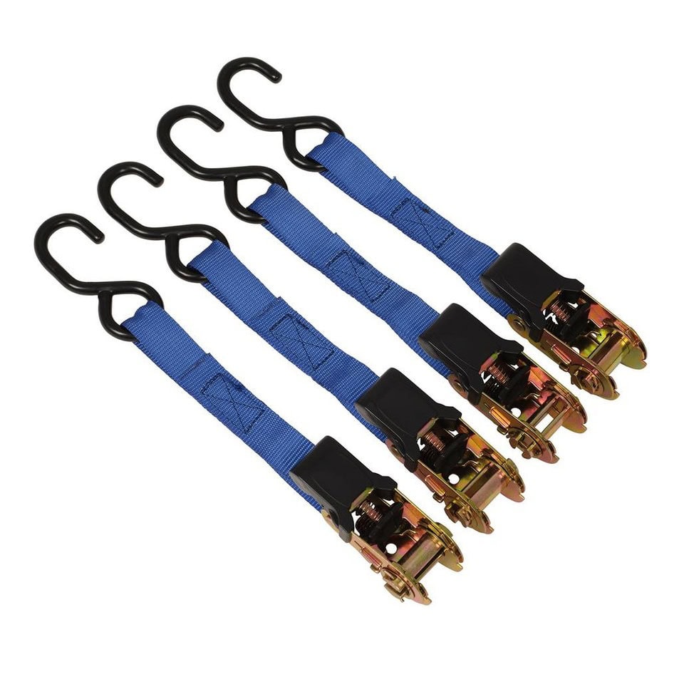 Spanbanden voor het zekeren van ladingen tijdens transport. De banden zijn vervaardigd uit hoogwaardig geweven polyester en zijn elk voorzien van twee ‘S’-haken voor eenvoudige bevestiging. De set bestaat uit vier complete spanbanden met ratelsluiting.