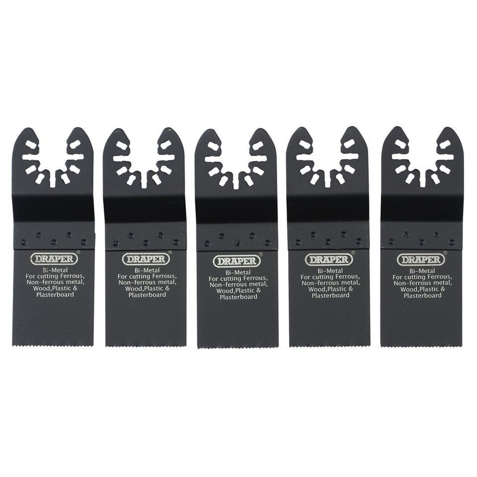 Set van vijf bi-metalen invalzaagbladen voor oscillerende multitools. Geschikt voor het zagen van staal, non-ferro metalen, hout, kunststof en gipsplaat. De universele aansluiting maakt de bladen compatibel met Draper en de meeste andere merken multitools.