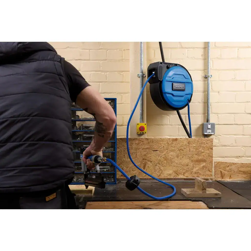 Deze robuuste luchthaspel van Draper is een ideale oplossing voor een georganiseerde werkplaats. De haspel is uitgerust met een soepel auto-rewind mechanisme en een geïntegreerde slanggeleider, wat zorgt voor een nette en probleemloze retractie van de slang. De hybride slang is niet alleen uiterst duurzaam en bestand tegen chemicaliën, maar heeft ook geen geheugeneffect, waardoor hij altijd vlak op de grond blijft liggen zonder hinderlijk op te krullen.