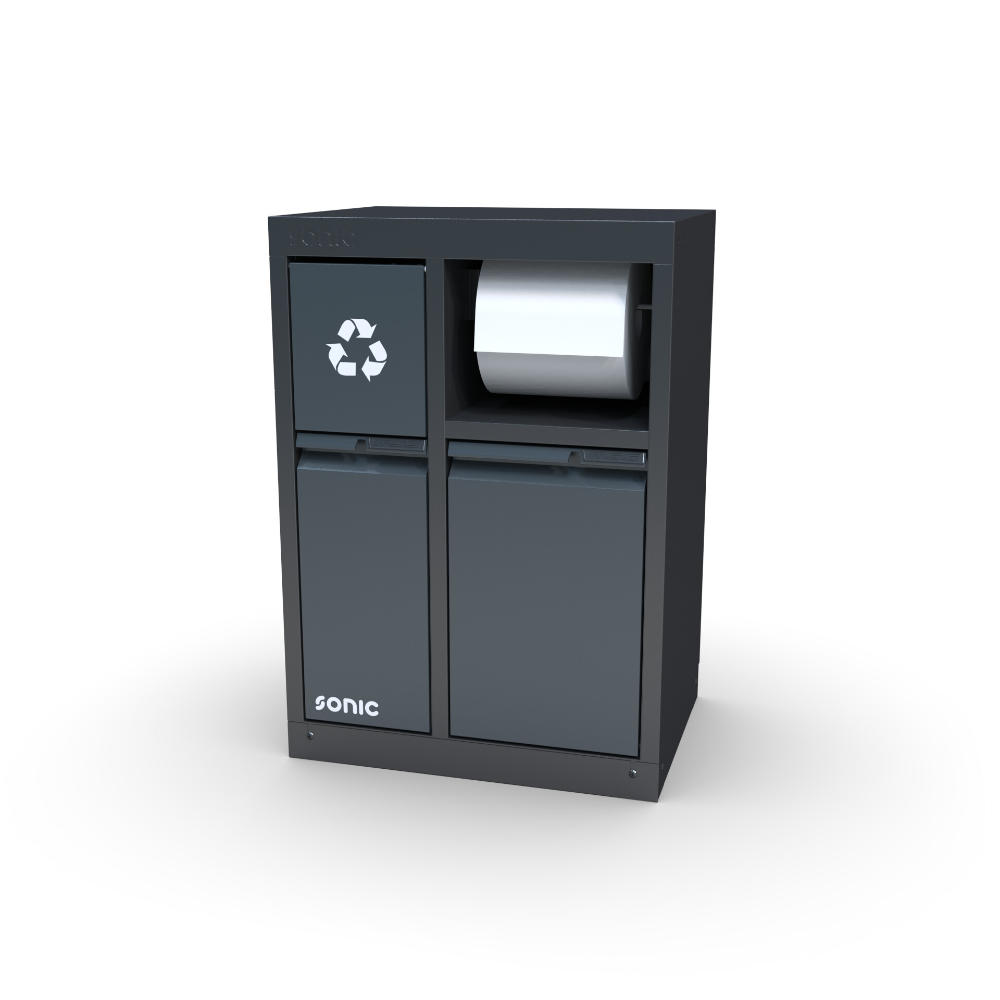 Vooraadstatus laden...Afval- en recyclingkast met geïntegreerde papierrolhouder, geschikt voor nette en efficiënte afvalscheiding in de werkplaats.