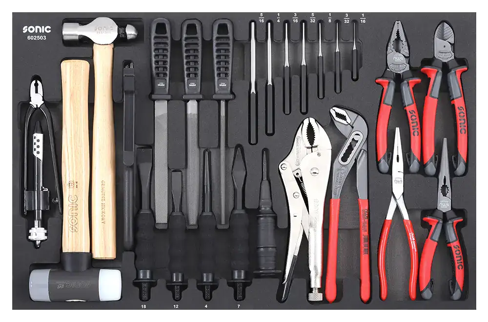 - Beitel, hammer, tangen en vijlenset SFS-M (25-delig): Productnummer 602503