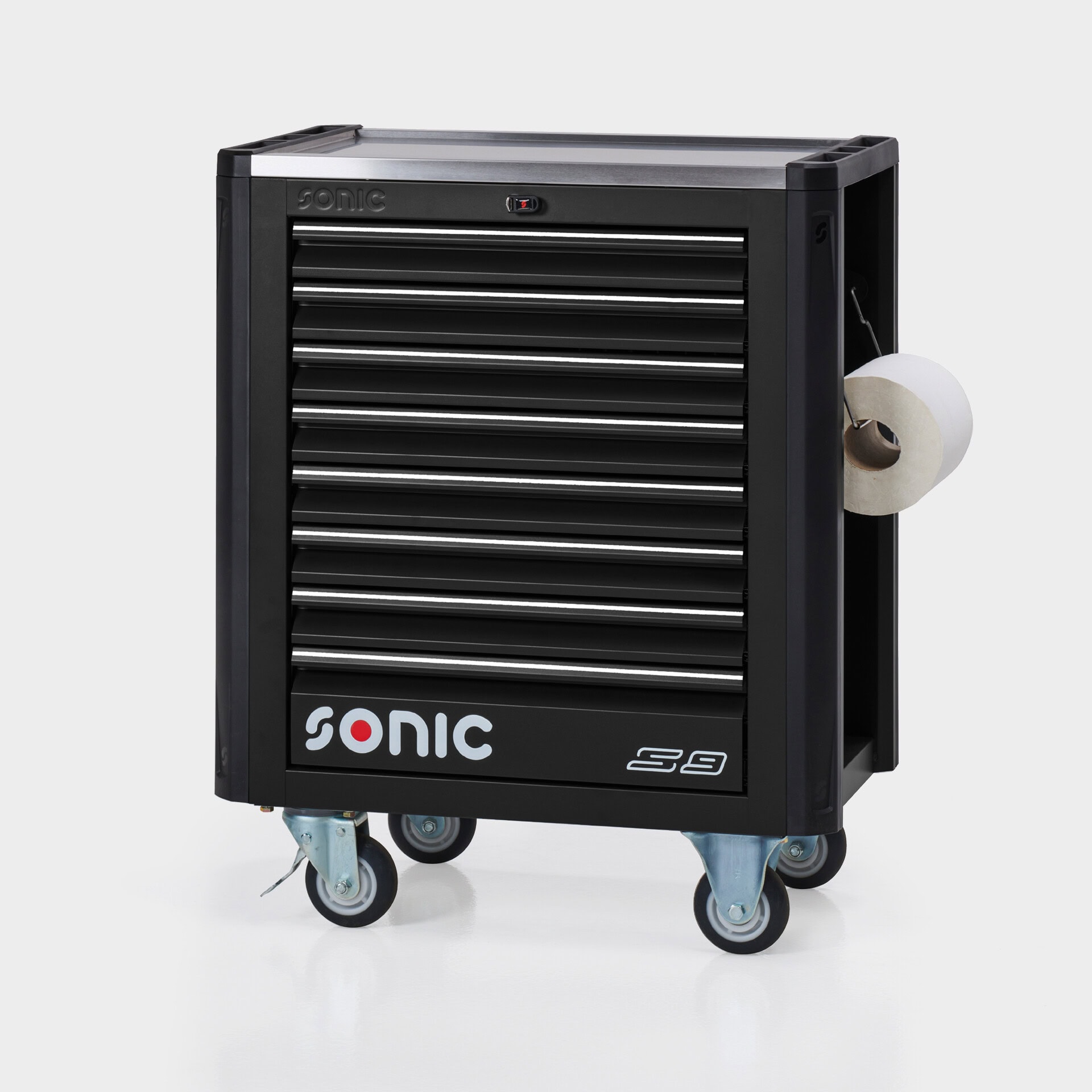 De Sonic NEXT S9 is een gereedschapswagen met een ruimtebesparend ontwerp van 84 cm breed en 50 cm diep. De kar biedt een combinatie van compacte buitenmaten met een hoge opslagcapaciteit, verdeeld over acht lades.