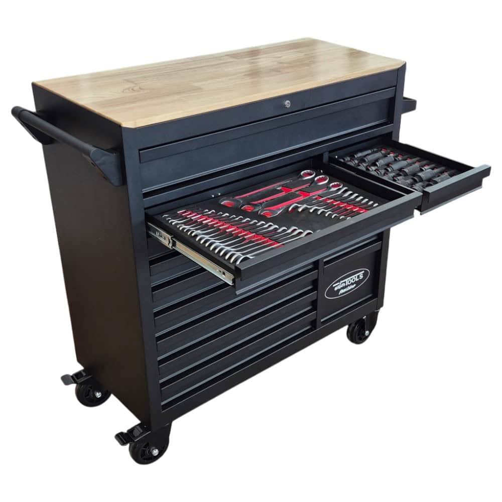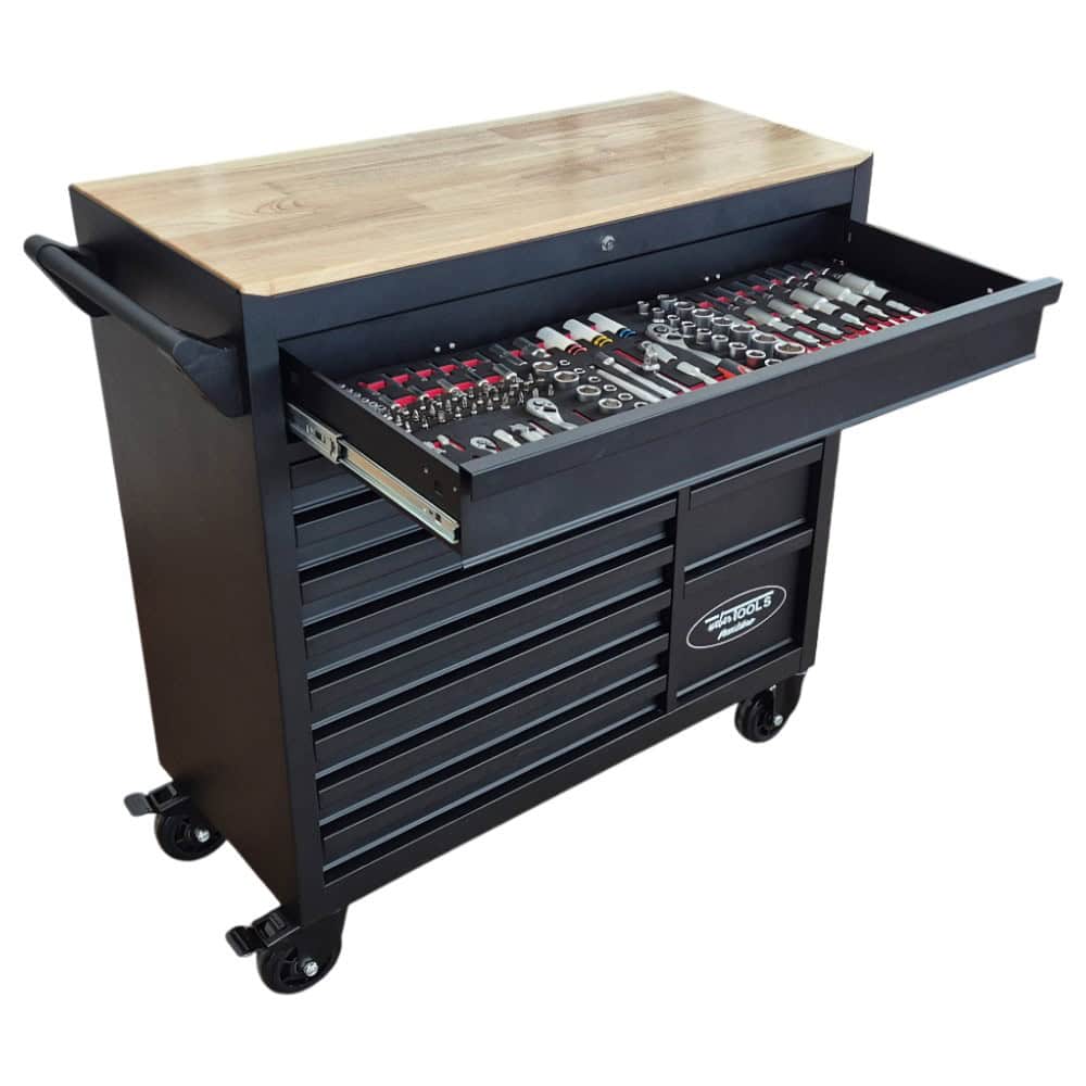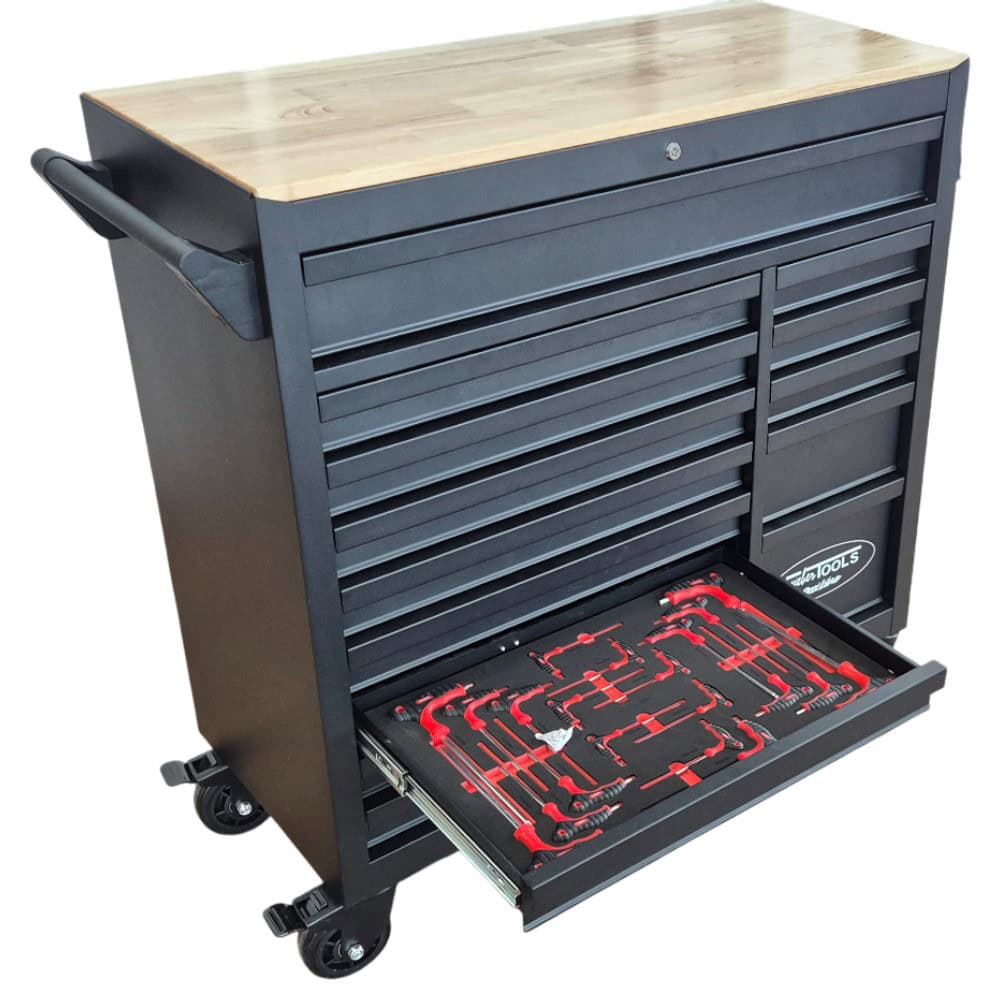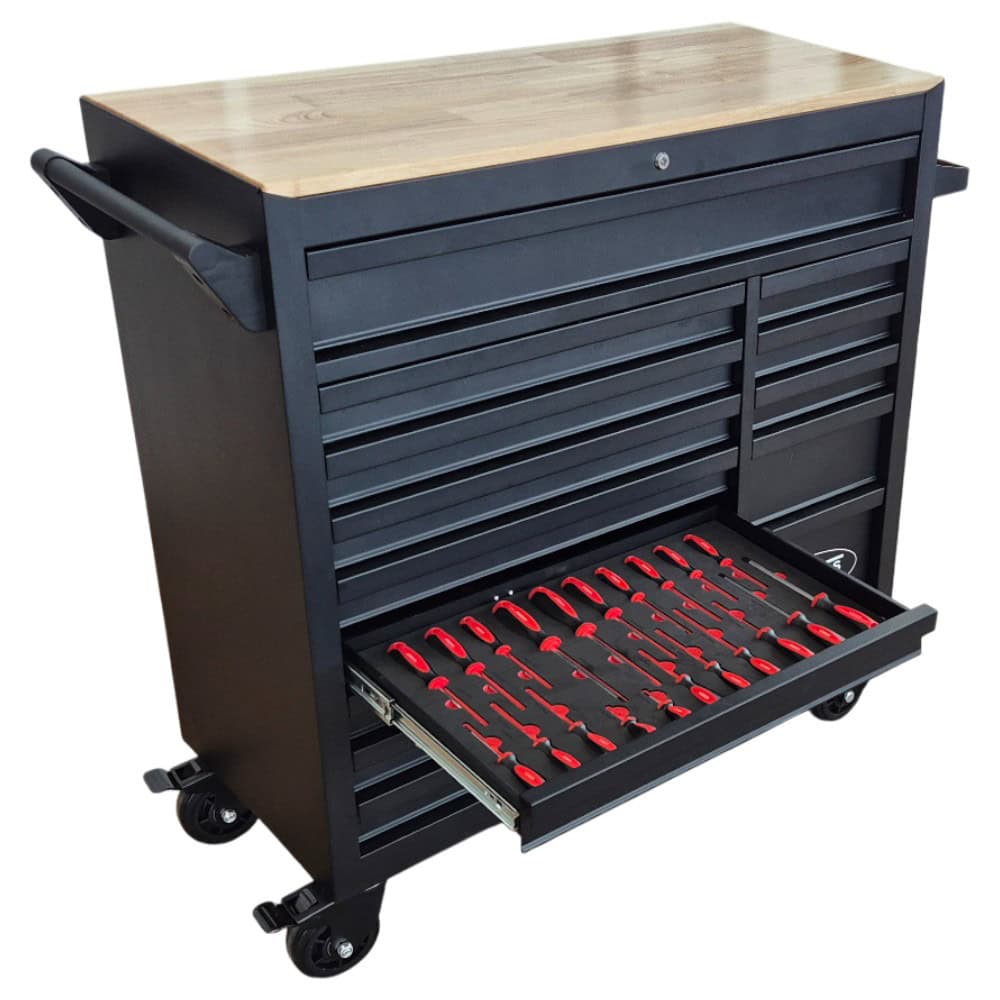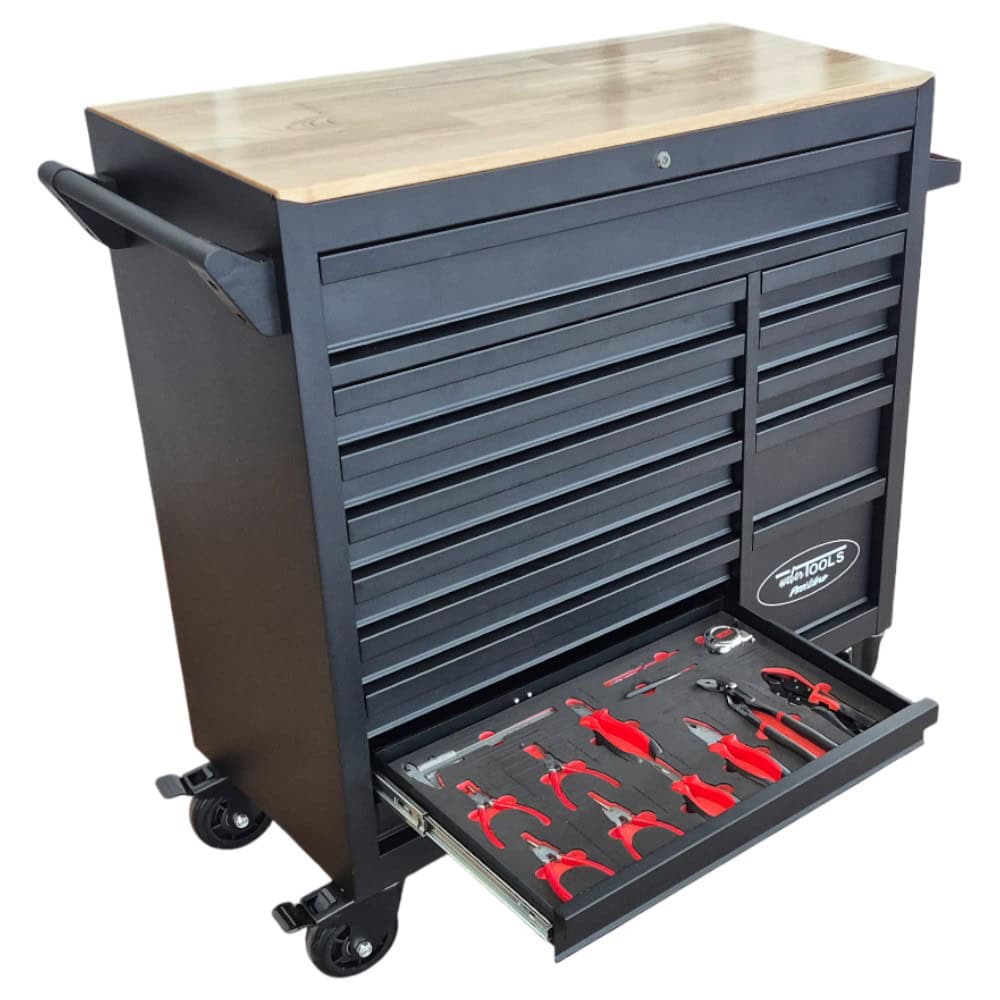Gereedschapswagen met 14 laden, waarvan 11 zijn uitgerust met gereedschap in olie- en benzinebestendige foammodules. De overige 3 laden bieden extra opbergruimte. Voorzien van een houten werkblad en een zijbak voor spuitbussen of vloeistoffen. De wagen is afsluitbaar en uitgerust met een ladeblokkeersysteem.