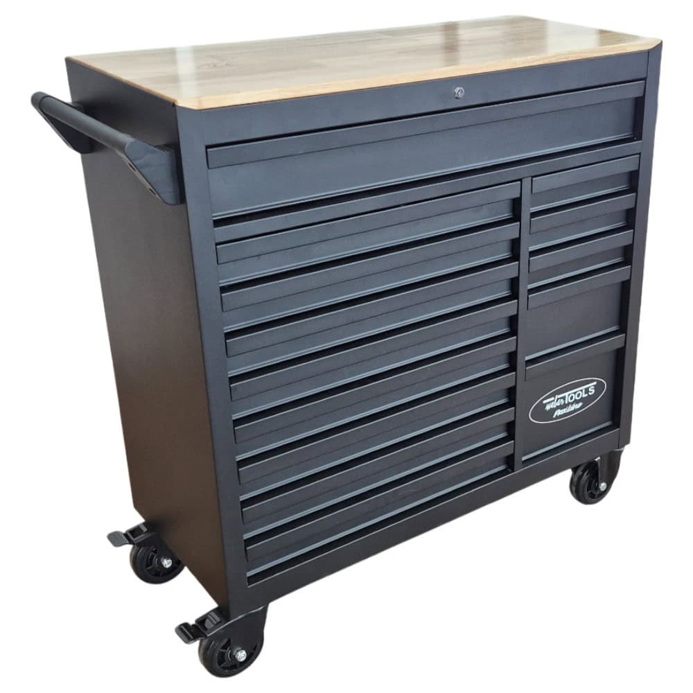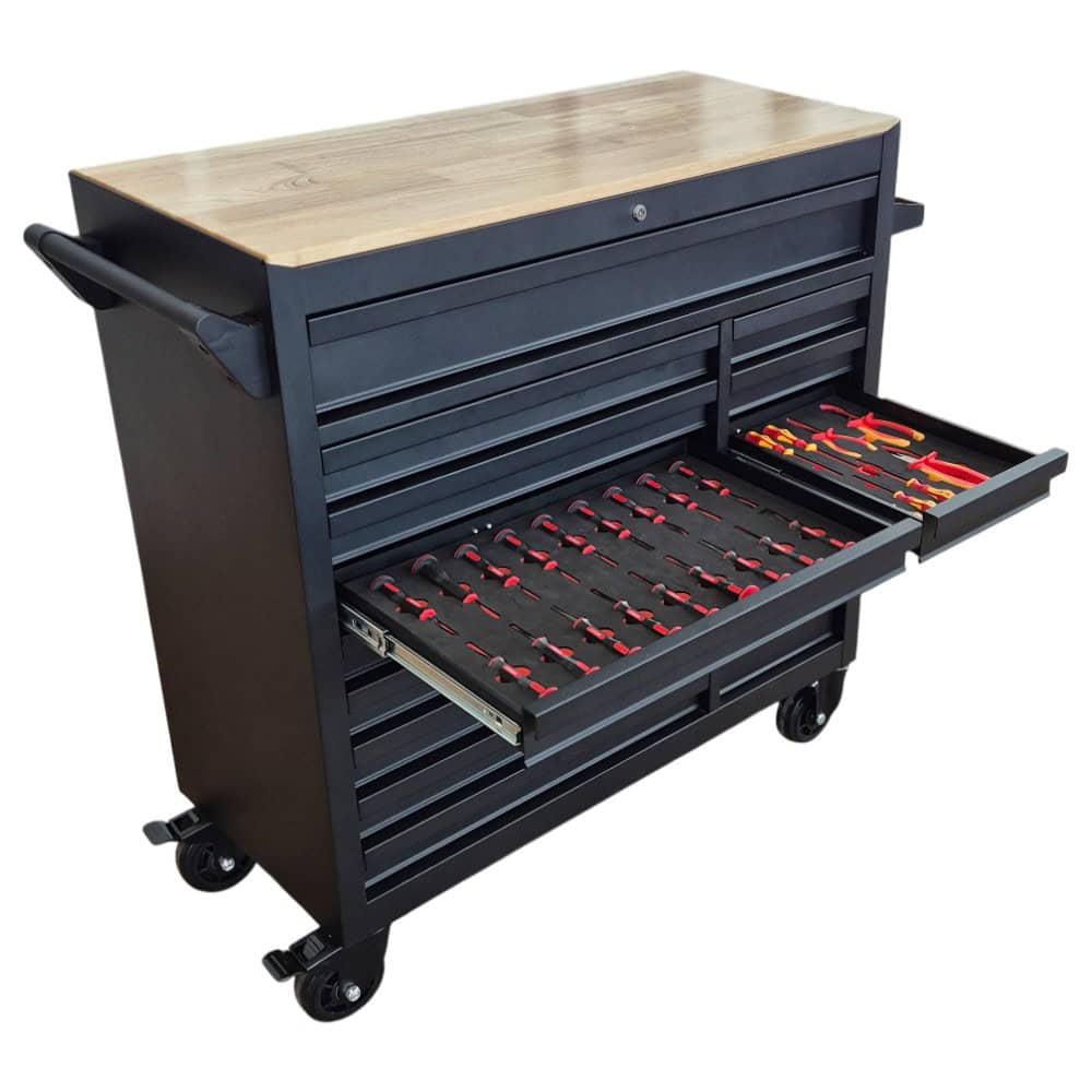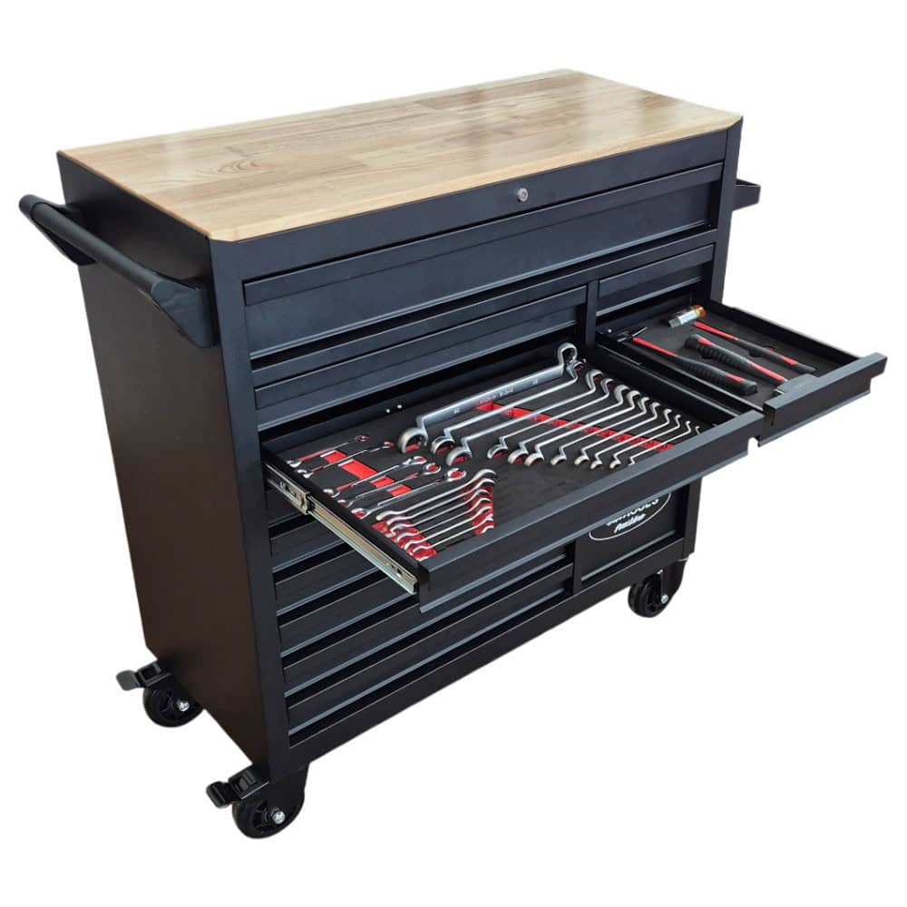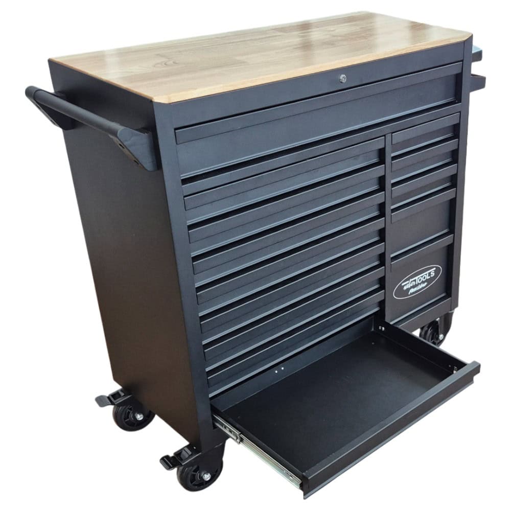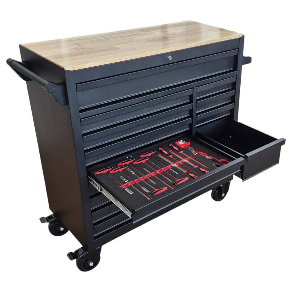 Gereedschapswagen met 14 laden, waarvan 11 zijn uitgerust met gereedschap in olie- en benzinebestendige foammodules. De overige 3 laden bieden extra opbergruimte. Voorzien van een houten werkblad en een zijbak voor spuitbussen of vloeistoffen. De wagen is afsluitbaar en uitgerust met een ladeblokkeersysteem.
