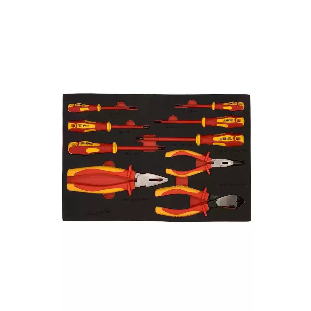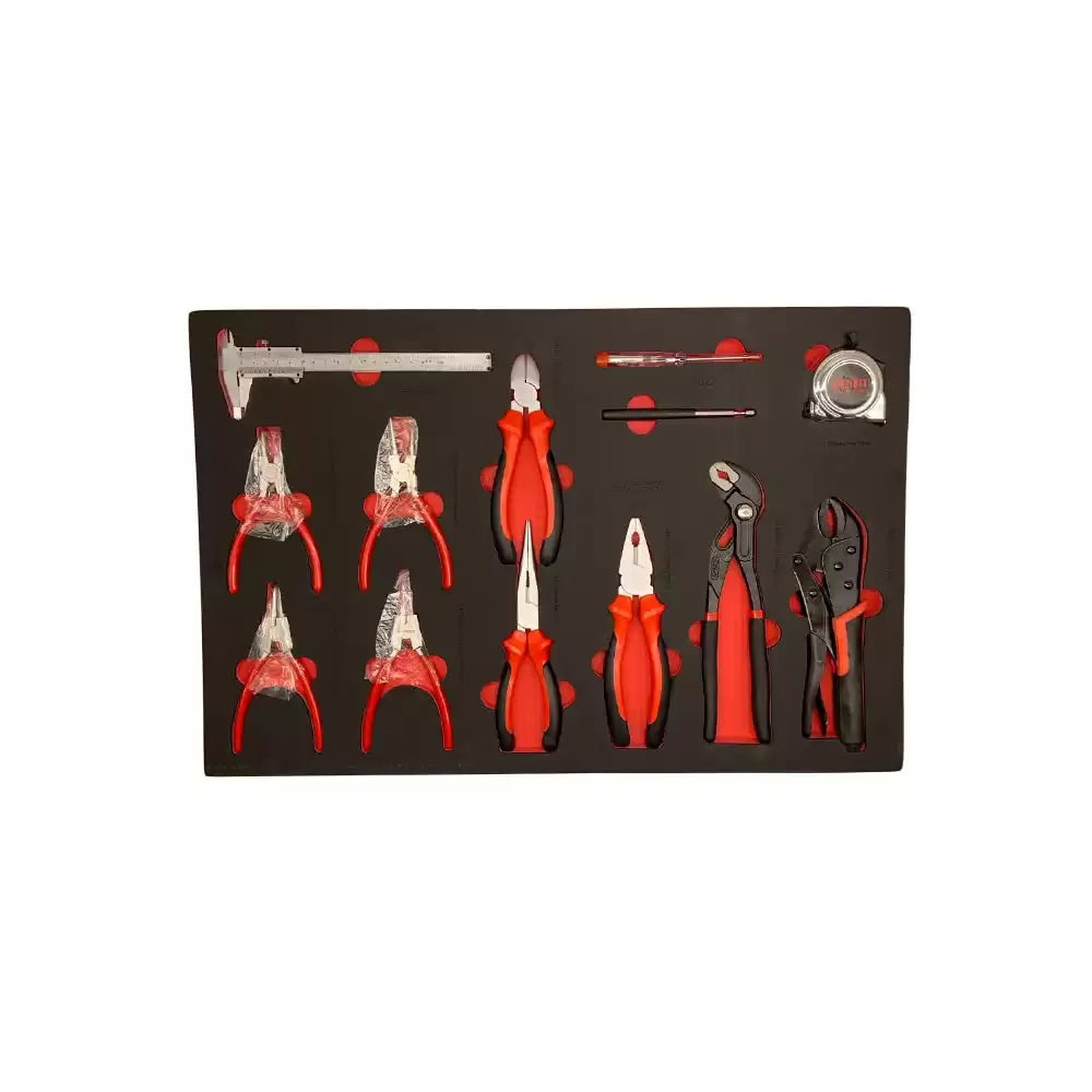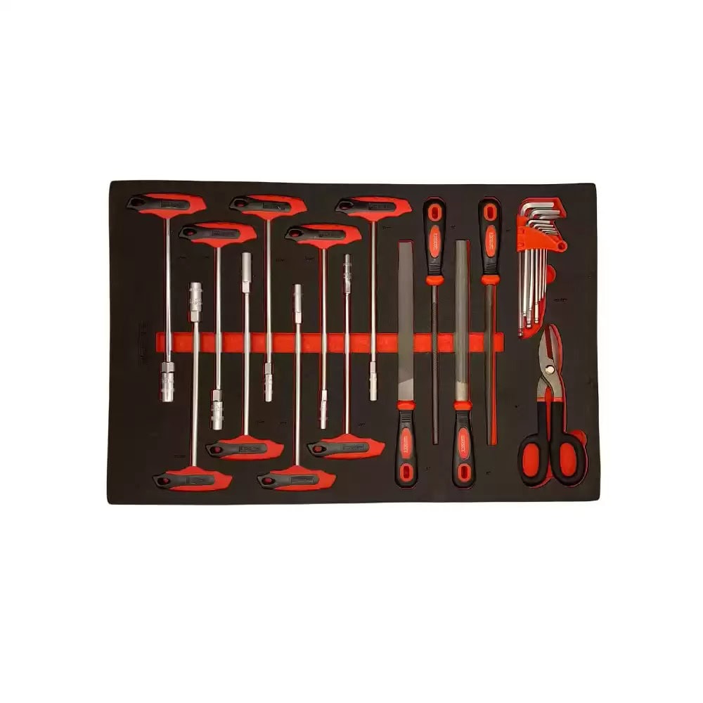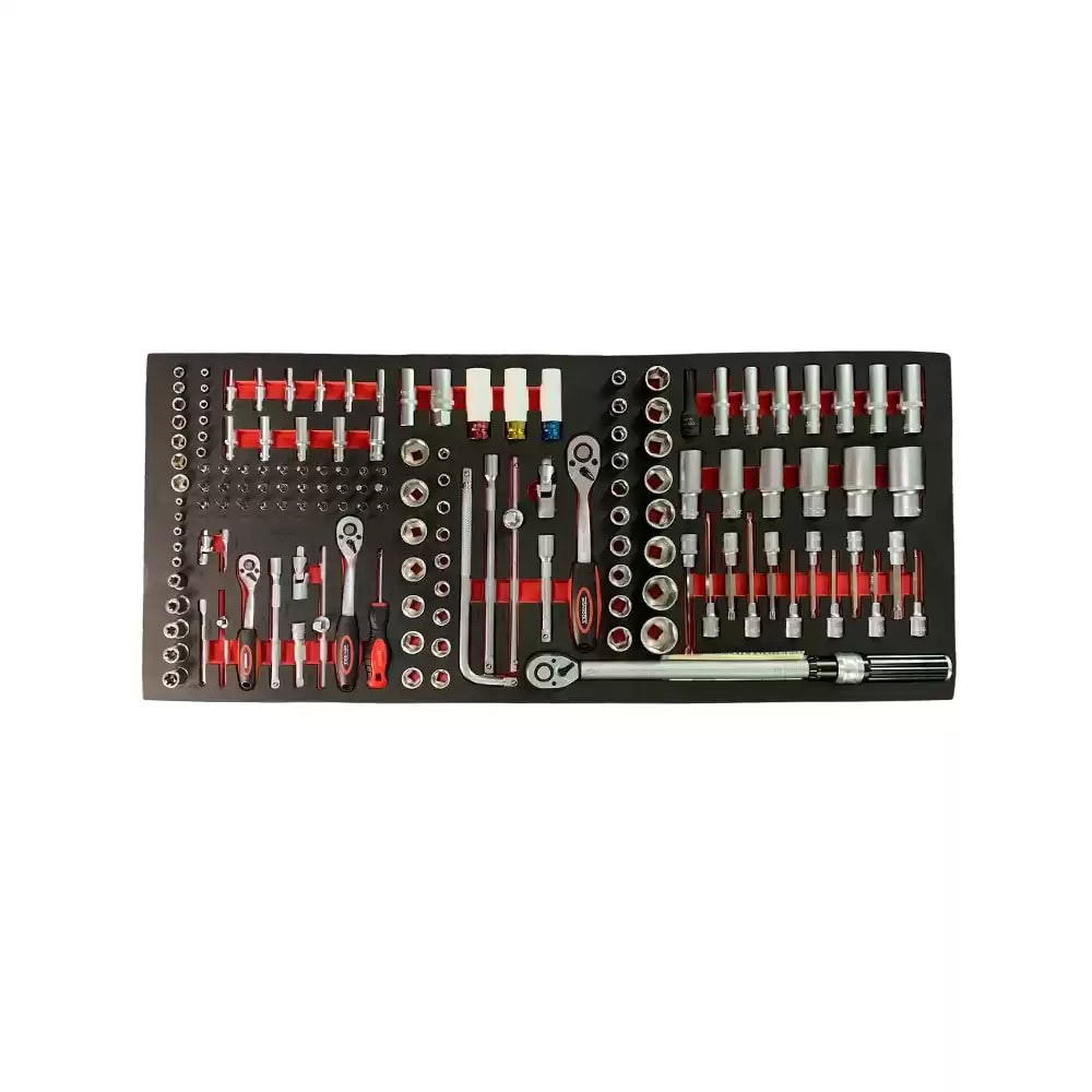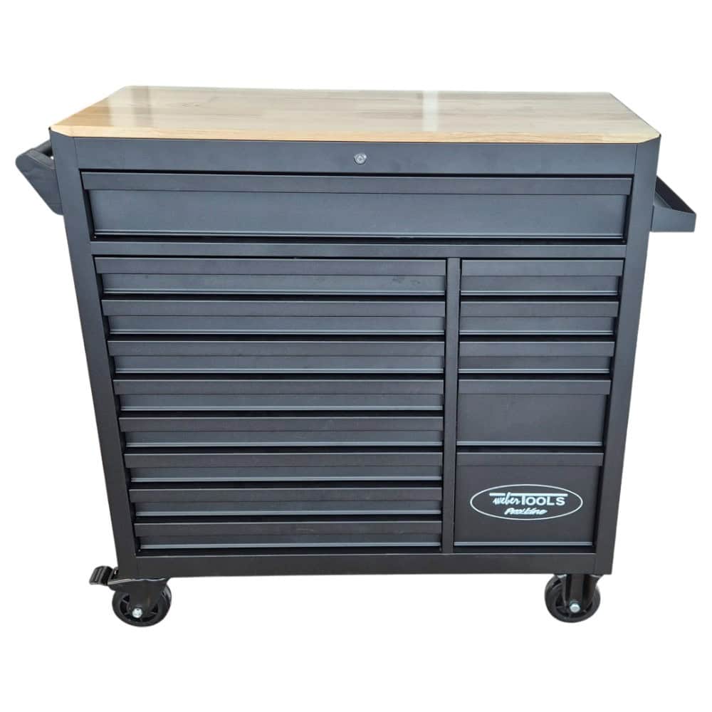 Gereedschapswagen met 14 laden, waarvan 11 zijn uitgerust met gereedschap in olie- en benzinebestendige foammodules. De overige 3 laden bieden extra opbergruimte. Voorzien van een houten werkblad en een zijbak voor spuitbussen of vloeistoffen. De wagen is afsluitbaar en uitgerust met een ladeblokkeersysteem.