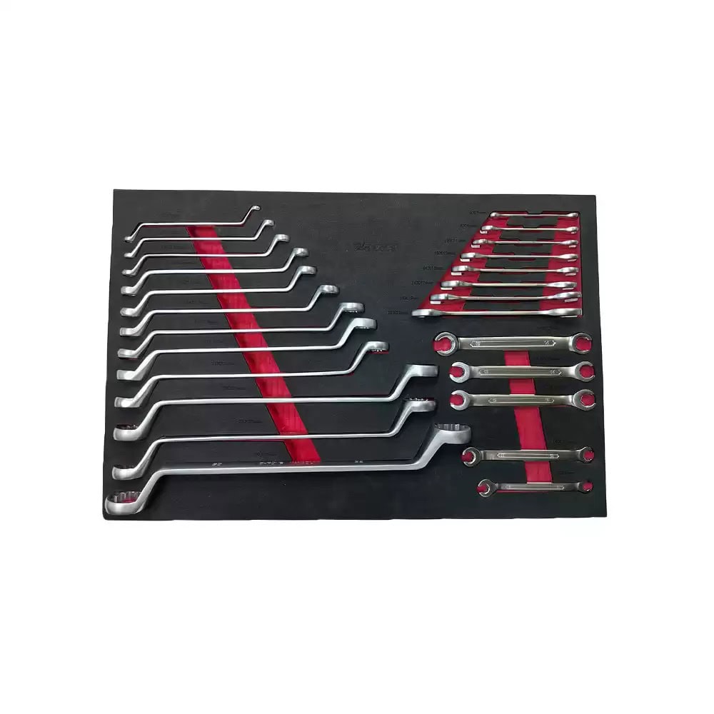 - Dubbele steeksleutels open: 6×7 – 8×9 – 10×11 – 12×13 – 14×15 – 16×17 – 18×19 – 20×22 mm