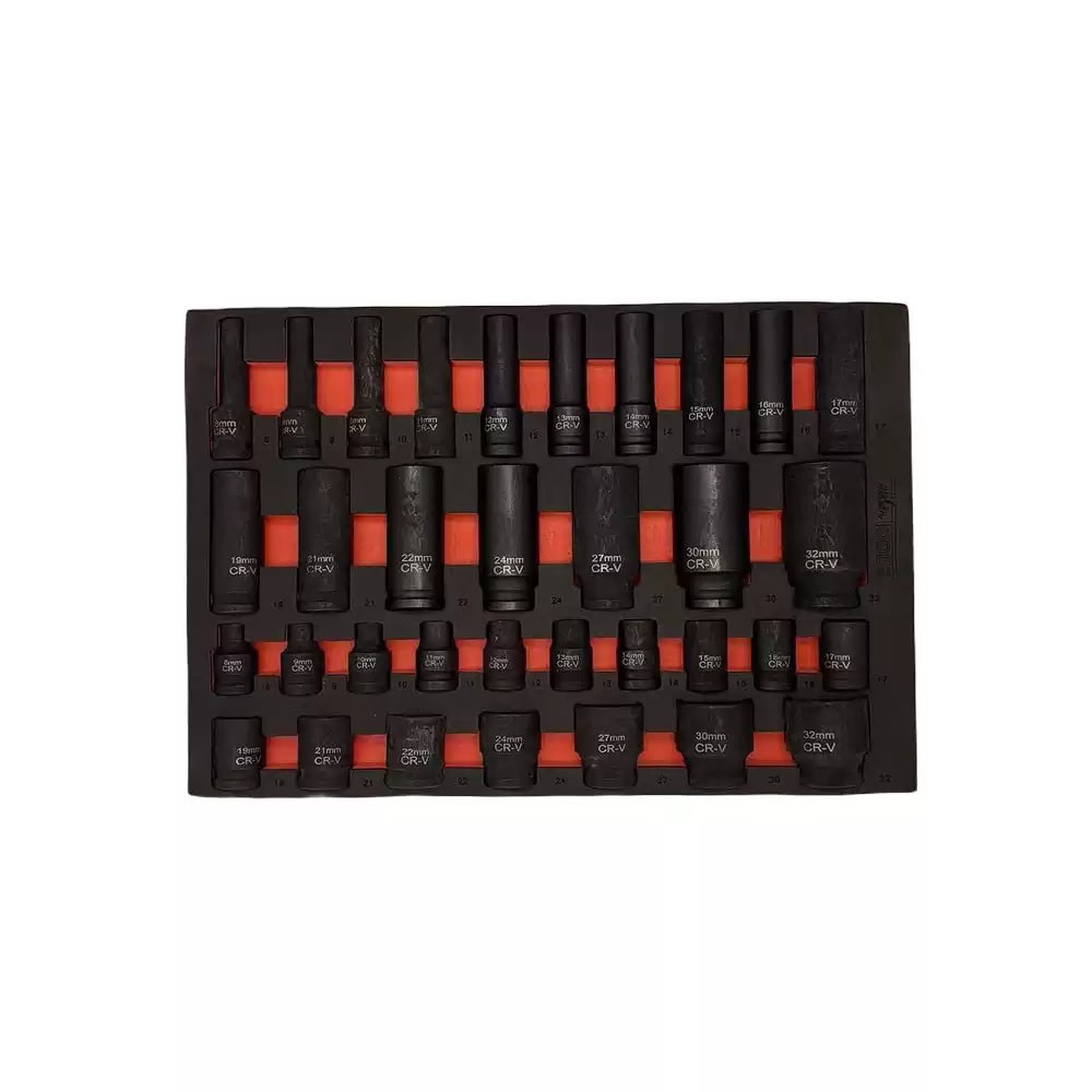 - 1/2” Diepe doppen: 14 – 15 – 16 – 17 – 18 – 19 – 21 – 22 – 23 – 24 – 27 – 30 – 32 mm